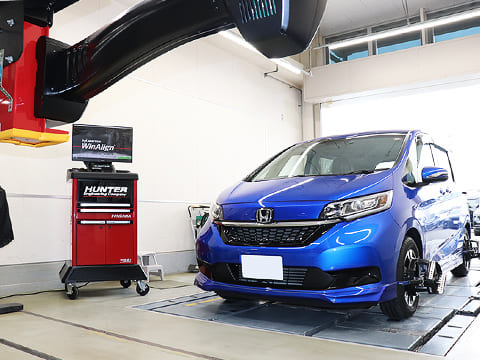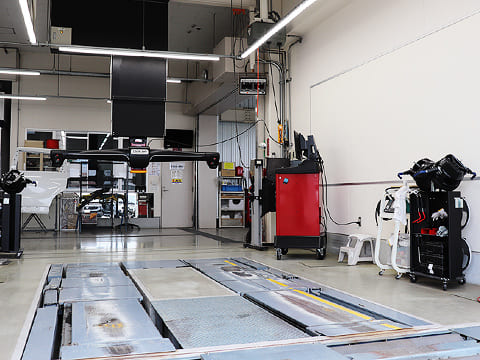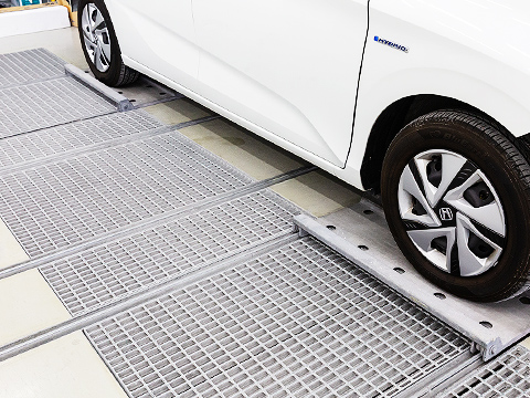 修理車両のブレーキ・サスペンションを光学センサーのテスターでチェックする完成検査ラインです。最新のアライメントテスターを使用しています。