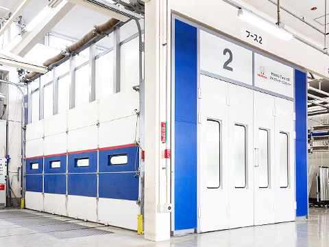 温度コントロールされた塗装専用ブースで、ホコリ等を塗装に附着しにくくさせています。車両はスペース効率を上げるため、台車に乗せ、横にスライドさせて入庫します。完璧なマスキング作業とツヤのあるペイントを施します。
