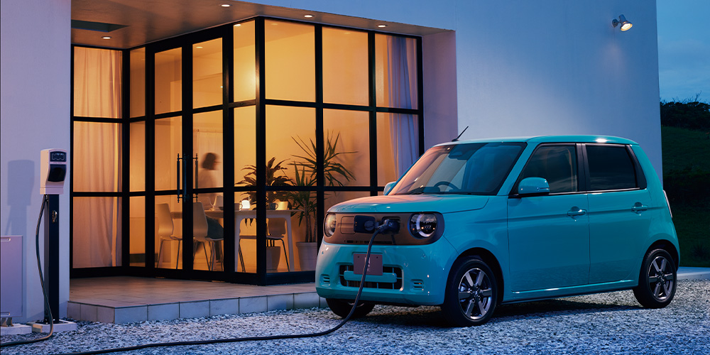 <右>N-ONE e: L 車両本体価格(消費税10%込み) 3,198,800円★ 価格には写真の有料色の価格は含まれておりません。 ボディーカラーはチアフルグリーン(有料色:33,000円高)■V2Hには別途、V2H機器と設置工事が必要です。■V2H機器は撮影のために用意したものです。