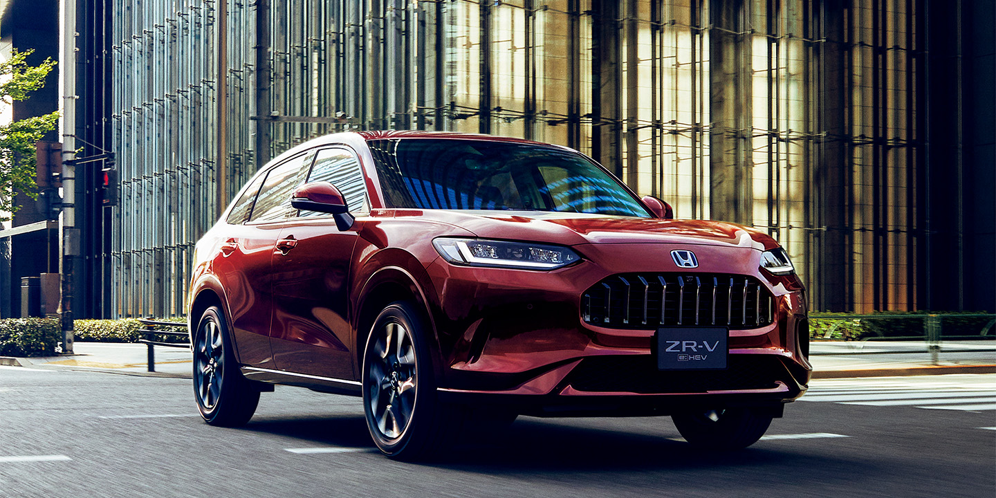 <右>ZR-V e:HEV X(FF) 車両本体価格(消費税10%込み)3,634,400円★ 価格には写真の有料色の価格は含まれておりません。 ボディーカラーはプレミアムクリスタルガーネット・メタリック(有料色:60,500円高)