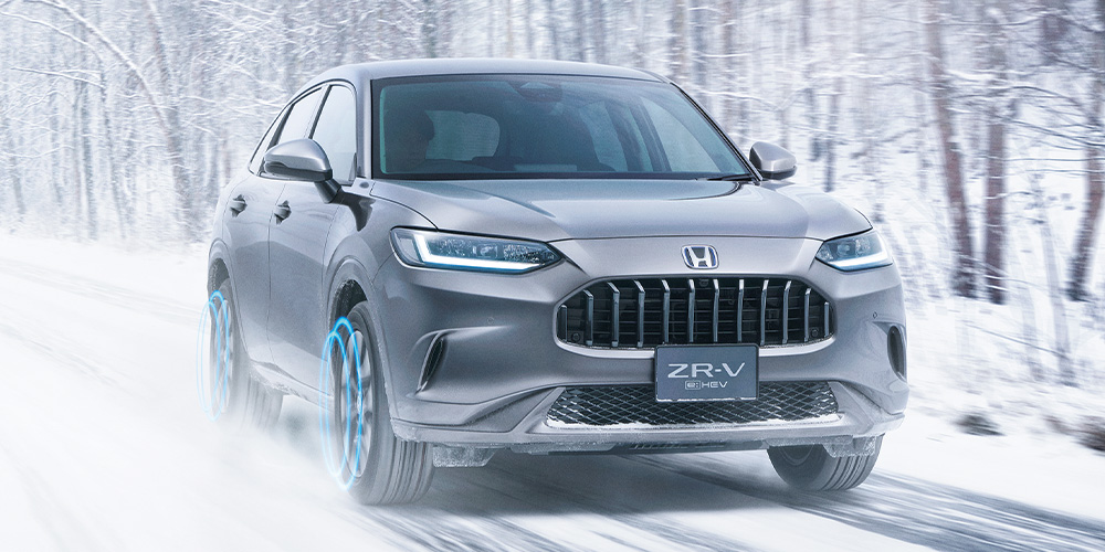 中段:<左>ZR-V e:HEV Z(4WD) 車両本体価格(消費税10%込み)4,455,000円★ 価格には写真の有料色の価格は含まれておりません。 ボディーカラーはスーパープラチナグレー・メタリック(有料色:38,500円高) インテリアカラーはブラック ■写真は合成です。雪道の走行時にはチェーンまたは冬用タイヤを装着してください。安全に配慮した運転にご留意ください。