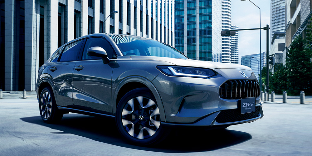 <右>ZR-V e:HEV Z(4WD) 車両本体価格(消費税10%込み)4,455,000円★ 価格には写真の有料色の価格は含まれておりません。 ボディーカラーはスーパープラチナグレー・メタリック(有料色:38,500円高) インテリアカラーはブラック