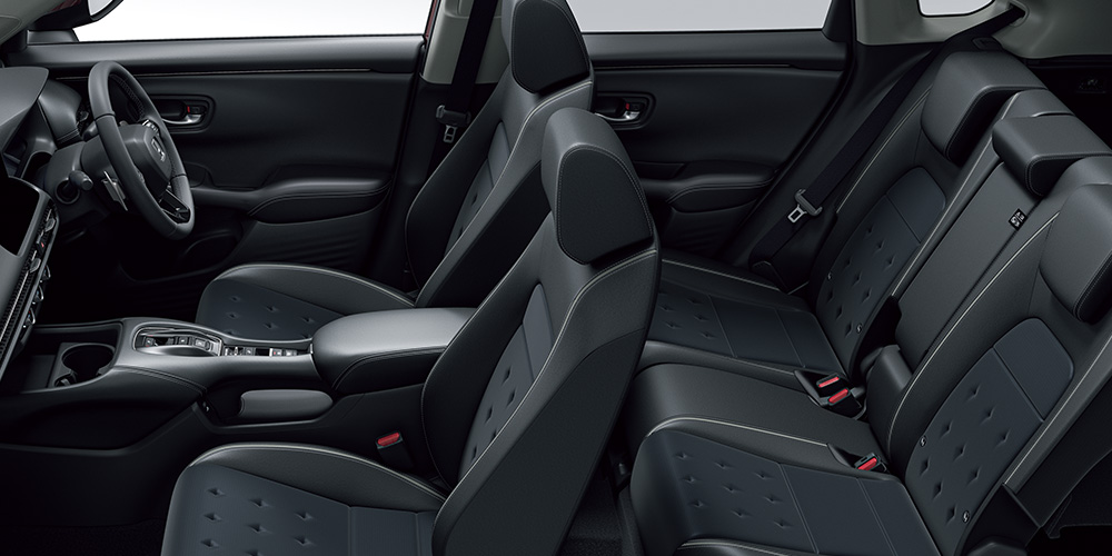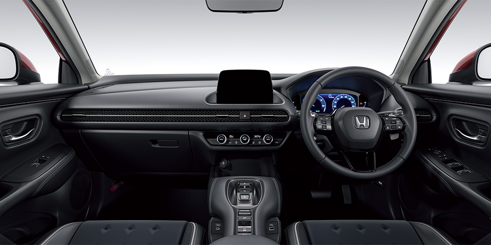 <中央>ZR-V e:HEV X(FF) 車両本体価格(消費税10%込み)3,634,400円★ 価格には写真の有料色の価格は含まれておりません。 ボディーカラーはプレミアムクリスタルガーネット・メタリック(有料色:60,500円高) インテリアカラーはブラック ■カットボディーによる撮影。