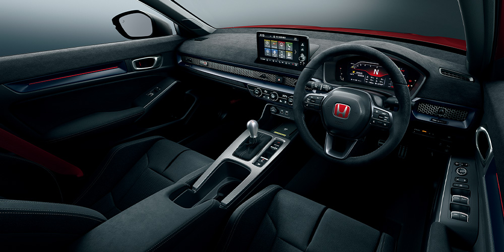 下段:<左>シビック TYPE R RACING BLACK Package 車両本体価格(消費税10%込み)5,998,300円★ ボディーカラーはフレームレッド ■メーター類は撮影のため点灯。 ■画面はハメコミ合成。