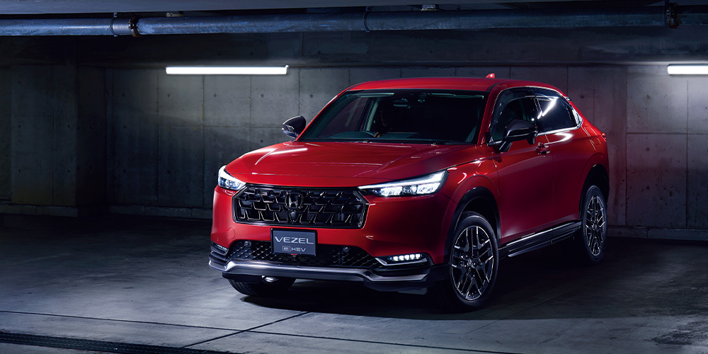<中央>ヴェゼル e:HEV Z(FF) 車両本体価格(消費税10%込み)3,268,100円★ 価格には写真の有料色及びディーラーオプションの価格は含まれておりません。 ボディーカラーはプレミアムクリスタルレッド・メタリック(有料色:60,500円高) ディーラーオプション(フロントグリル〈ベルリナブラック〉+ブラックエンブレム:52,800円、フロントロアースカート〈ベルリナブラック/クロームメッキガーニッシュ付〉:42,900円、フォグライトガーニッシュ〈クロームメッキ/左右セット〉:11,000円、サイドロアーガーニッシュ〈ベルリナブラック/左右セット〉:35,200円、ドアミラーカバー〈クリスタルブラック・パール/左右セット〉:9,900円、テールゲートスポイラー〈クリスタルブラック・パール〉:55,000円、リアロアーガーニッシュ〈ベルリナブラック/クロームメッキガーニッシュ付〉:24,200円、リアロアースカート〈ベルリナブラック/セパレート(左右分割)タイプ〉:24,200円、Cピラーデカール〈左右セット〉:11,000円、18インチ アルミホイール MS-050〈切削/グリントブラック塗装〉:187,352円、アルミホイールセンターキャップ〈クロームメッキ/4個セット〉:10,648円、ドアバイザー〈フロント・リア用左右4枚セット〉:26,400円、エキパイフィニッシャー:9,900円、ヴェゼル専用 9インチ プレミアム インターナビ〈Honda CONNECT対応〉VXU-245VZi[取付アタッチメント/フェイスパネルキット/変換ハーネス含む]:245,300円、ドライブレコーダー〈前後車内3カメラセット DRH-229ND+後方・車内録画カメラ〉[取付アタッチメント含む] :67,100円、フロントカメラシステム[取付アタッチメント含む]:33,000円、ライセンスフレーム〈ベルリナブラックタイプ/フロント用・リア用〉:9,900円〈すべて取付工賃別途〉)装着車