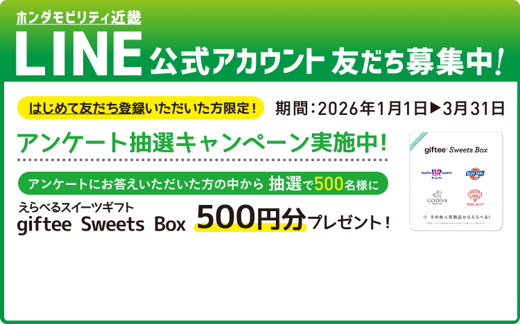 【LINE公式アカウントアンケート抽選キャンペーンについて】●弊社公式アカウントより配信されたアンケートへご回答いただいた方の中から、抽選で当選されました500名様に上記デジタルギフトをプレゼントいたします。●2023年3月31日以前に既に「Honda Cars 大阪/南近畿奈良・和歌山」のアカウントに友だち登録いただいていた方、及び2025年12月31日以前に既に「ホンダモビリティ近畿」のアカウントに友だち登録いただいていた方は、対象外となります。●当選発表はギフトURLの記載されたメッセージのお届けをもって代えさせていただきます。●都合により商品が変更になる場合がございます。●ギフトのご利用は、期限がございます。また期限の延長は致しかねますので、ご了承ください。