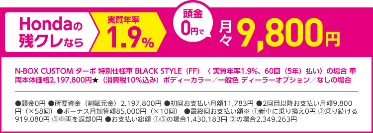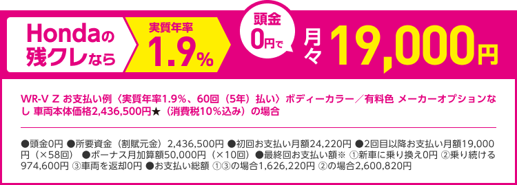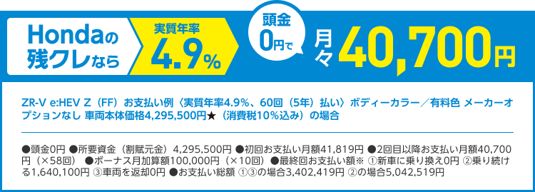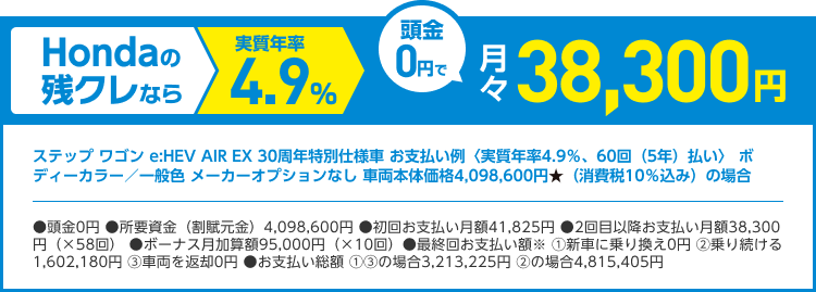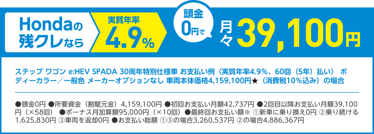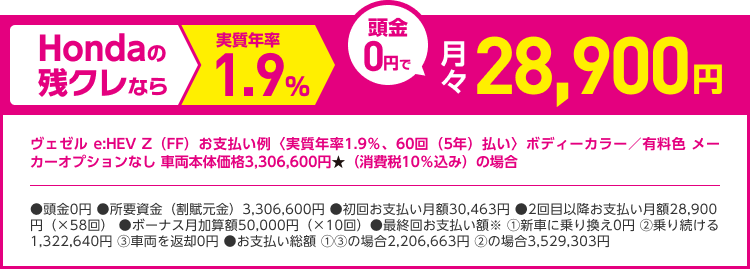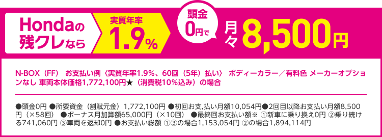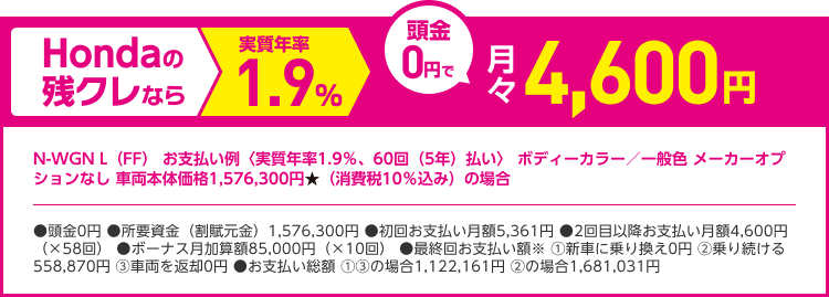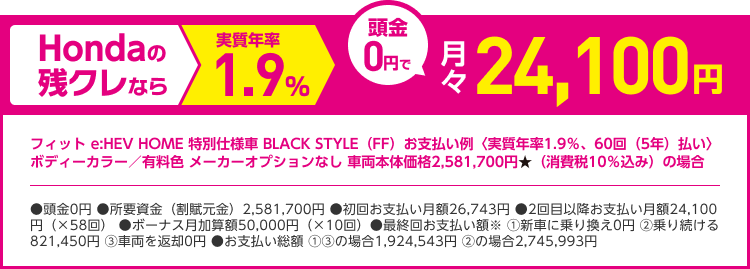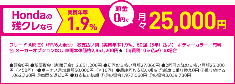 【残価設定型クレジットのお支払い例について】・上記お支払い例は2026年1月の一例です。・上記お支払い例は、初回お支払い月を2026年3月、初回ボーナス月を2026年7月(以下ボーナス月は1月・7月)で計算した一例です。※本クレジットは最終回に、@新車に乗り換えA乗り続ける(最終回お支払い額を一括または再クレジットでお支払い)B車両を返却 のいずれかをお選びいただけます。@、Bの場合、内外装キズや走行距離などの確認事項があります。事前に定めた条件を超える場合には、その差額分を別途ご負担いただきます。詳しくは営業スタッフまでお問い合わせください。