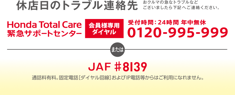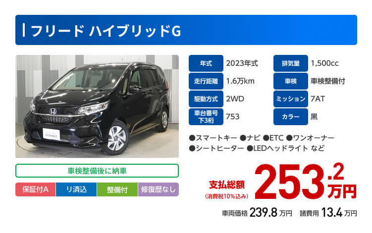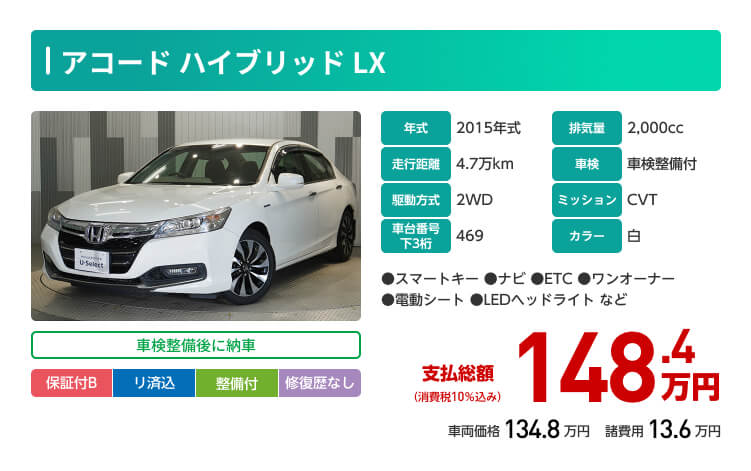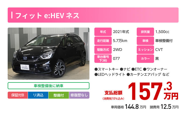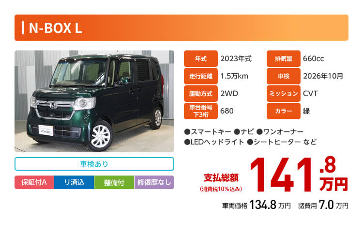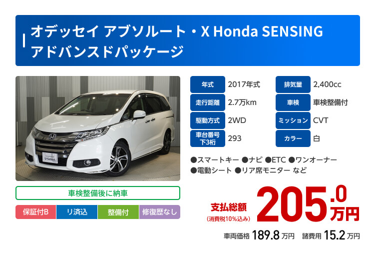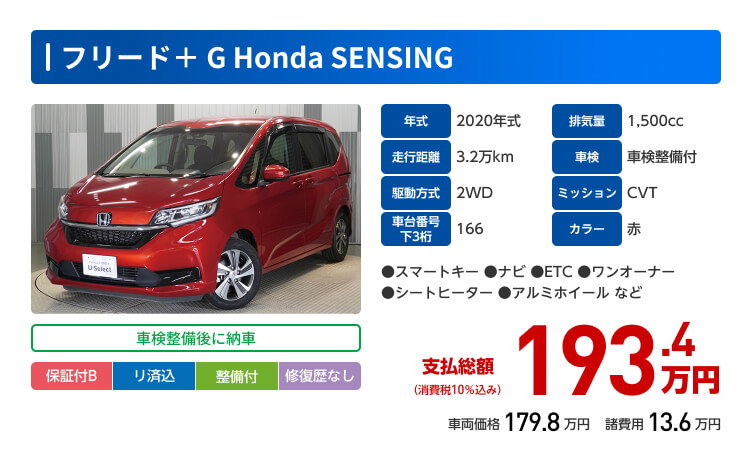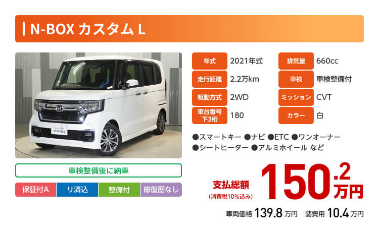 ■支払総額は、1月現在、販売店の管轄の運輸支局等で登録(届出)で店頭納車の場合の価格です。お客様の要望に基づくオプション等の費用は別途申し受けます。支払総額には、税金及び自賠責保険料、自動車リサイクル料金、登録等に伴う費用等、購入の際に必要な全ての費用が含まれています。■価格はすべて消費税10%込みの価格です。■現車は店頭にて十分ご確認の上、ご検討ください。上記掲載内容についてご不明な点はスタッフにお尋ねください。■車検整備付・・・車検証の有効期限が切れています。24ヶ月点検を実施し(定期点検整備費用は支払総額に含まれます)、車検を取得して納車します。■ETC車載器を使用するには、別途決済用のETCカード、セットアップ作業(セットアップ費用)が必要となります。■掲載内容に明らかな不備があった場合、やむなく販売をお断りすることがあります。あらかじめご了承ください。■詳しくは営業スタッフまでお問い合わせください。
