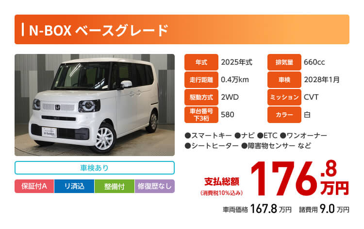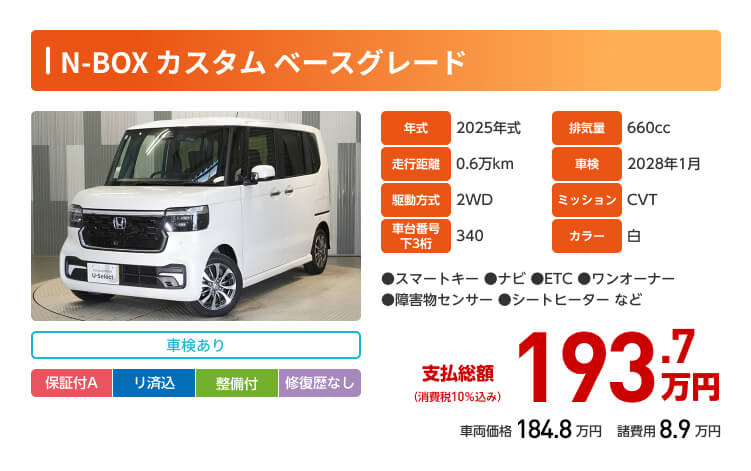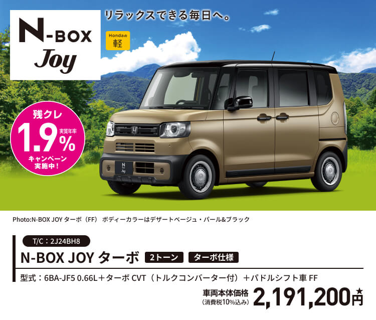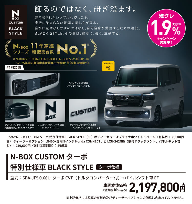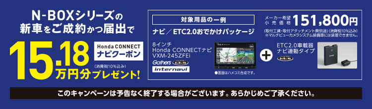 【N-BOXシリーズHonda CONNECTナビクーポンプレゼントについて】●N-BOX(CUSTOM/JOY含む)を新車でご成約かつ届出いただいた方が対象となります。●クーポンはご成約いただいた販売店でのみ有効です。●一部のタイプ、カラーによっては届出に時間を要するため対象とならない場合がございます。●クーポンは対象車種のHonda CONNECTナビにご利用いただけます。●ナビの種類・在庫状況によっては適用にならない場合がございます。●工賃・取付アタッチメント費はご成約者様のご負担となる場合がございます。●クーポン金額を超える代金は、ご成約者様のご負担とさせていただきます。また、総額がクーポン金額に満たない場合の返金、値引きはありません。●当キャンペーン権利の他人への譲渡や換金、値引きはできません。●プレゼントはご成約された車を対象として取付けします。●他のキャンペーンと併用できない場合があります。●価格はメーカー希望小売価格(消費税10%込み)で参考価格です。販売価格は販売会社が独自に定めております。詳しくは営業スタッフまでお問い合わせください。