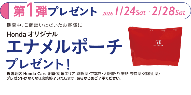 【Hondaオリジナルエナメルポーチプレゼントについて】●近畿地区のHonda Carsで、新車をご商談いただいた方が対象となります。●プレゼントの画像はイメージです。実物とは異なる場合がございます。●プレゼントは一組様おひとつとさせていただきます。●プレゼントの数には限りがございますので品切れの際はご容赦ください。●他のキャンペーンと併用できない場合がございます。●詳しくは販売会社までお問い合わせください。