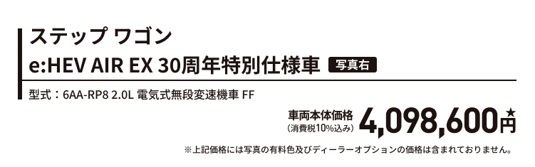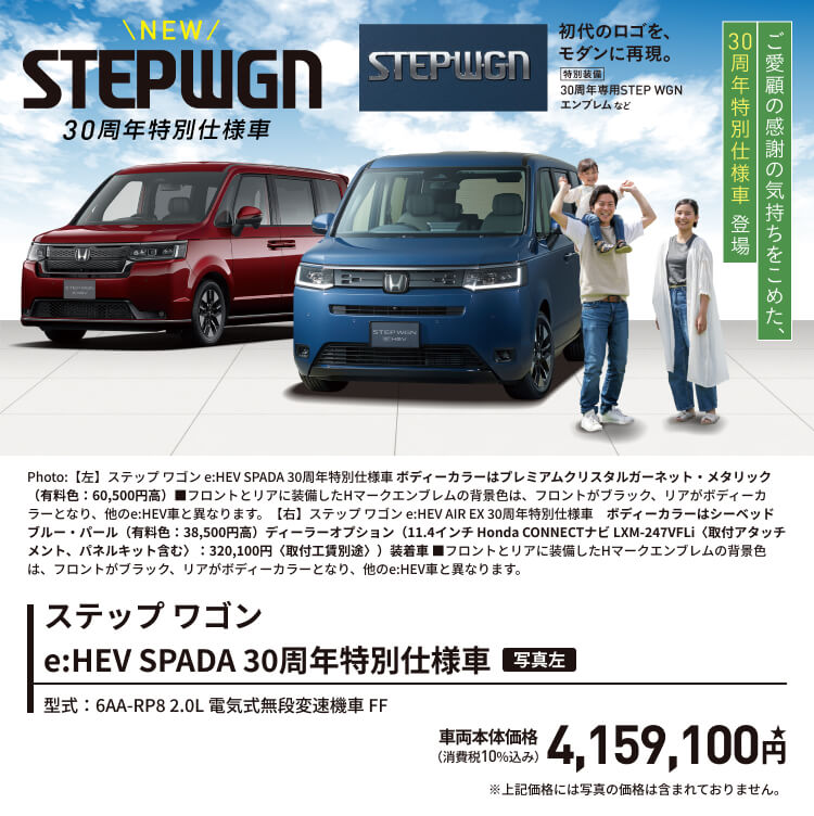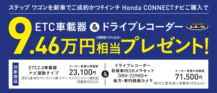 【ステップ ワゴンキャンペーンについて】このキャンペーンは予告なく終了する場合がございます。あらかじめご了承ください。●このキャンペーンはステップ ワゴンを新車でご成約かつHonda純正用品の9インチ Honda CONNECTナビ LXM-242ZFNi(メーカー希望小売価格207,900円(消費税10%込み)(取付工賃・取付アタッチメント費・パネルキット費・サブパネルキット費別途))をご購入の方が対象となります。●プレゼントはご成約いただいた販売店でのみ有効です。 ●プレゼントはご成約された車を対象として取付けします。 ●取付工賃、取付アタッチメント費、サブハーネスアタッチメント費、ETCセットアップ費等が別途必要となります。●ETC車載器を使用するには、別途決済用のETCカードが必要となります。●価格はメーカー希望小売価格(消費税10%込み)で参考価格です。販売価格は販売会社が独自に定めております。●当キャンペーン権利の他人への譲渡や換金、値引きはできません。●他のキャンペーンと併用できない場合があります。●詳しくは営業スタッフまでお問い合わせください。
