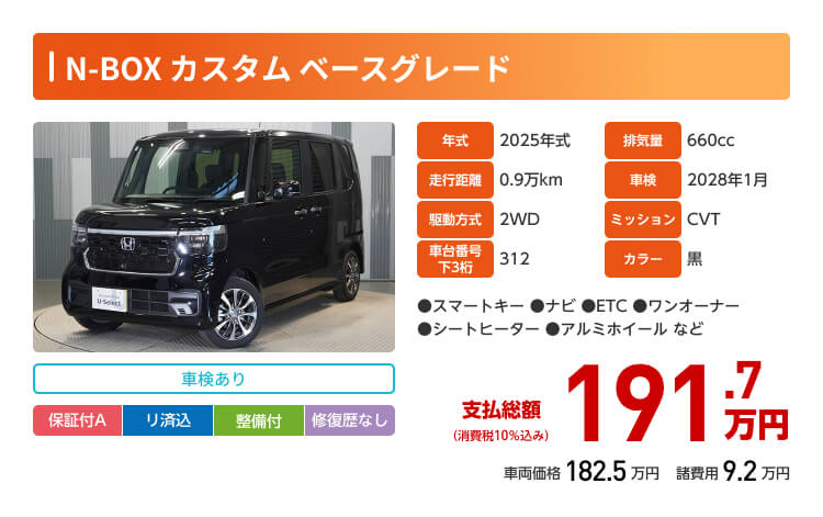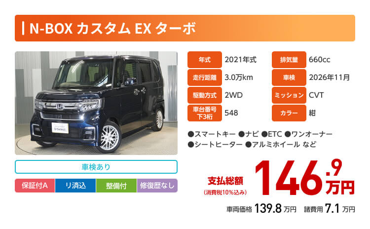 ★価格はすべて消費税 (10%) 込みの価格です。 車両本体価格には消費税以外の税金、保険料、登録等に伴う諸費用、 リサイクル料金は含まれておりません。